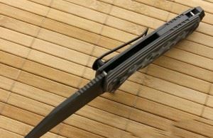 刀具柄部拥有强壮的铝合金内衬,并外贴“G-mascus”图案绿色G-10贴片。刀柄后端拥有嵌入式的系绳附件,背部隔垫和V形玻璃击破器。刀柄一侧上下段留有刀夹孔,配备黑色不锈钢镂空刀夹。此外,该侧刀轴附近还拥有锁定保护机制,当锁定时刀具衬垫无法收回并锁死刀片。