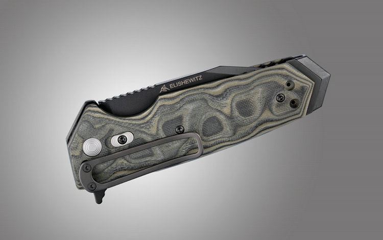 刀具柄部拥有强壮的铝合金内衬,并外贴“G-mascus”图案绿色G-10贴片。刀柄后端拥有嵌入式的系绳附件,背部隔垫和V形玻璃击破器。刀柄一侧上下段留有刀夹孔,配备黑色不锈钢镂空刀夹。此外,该侧刀轴附近还拥有锁定保护机制,当锁定时刀具衬垫无法收回并锁死刀片。