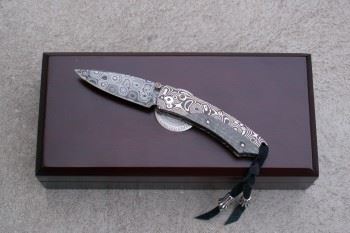 威廉亨利半手工刀(William Henry Fine Knives)被喻为全世界制作最好的半手工刀之一。自该品牌肇始之初均展现无比的制工与质量。其中,限量刀款更是延续William Henry的设计概念,增加更多奢华与细致,以满足顶尖人士高品味的需求。 这款编号B04"Pikatti"典藏刀,基本骨架为'Raindrop'纹的木目金,由Mike Sakmar制造。刀身钢材部份以知名工匠Mikr Norris所制作『波浪纹(Wave)』样式大马士革钢,拇指柱可自由装卸,满足不同方向用刀习惯,拇指柱与卡榫按钮均镶嵌褐水晶(smoky quartz),握柄尾端则镶嵌碳纤维板。