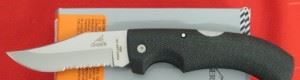 Gerber Gator Clip Point with locking partially serrated 440 series stainless steel blade and gator grip black kraton handle. Nylon belt sheath. Made in USA。 Overall Length: 8.75" Blade Length: 3.88" Blade Material: 440 Series (Stainless) Lock: Lock Back Closed Length: 4.87" Handle Material: Kraton Sheath: Nylon Weight: 5.00 oz. Country of Origin: USA
