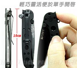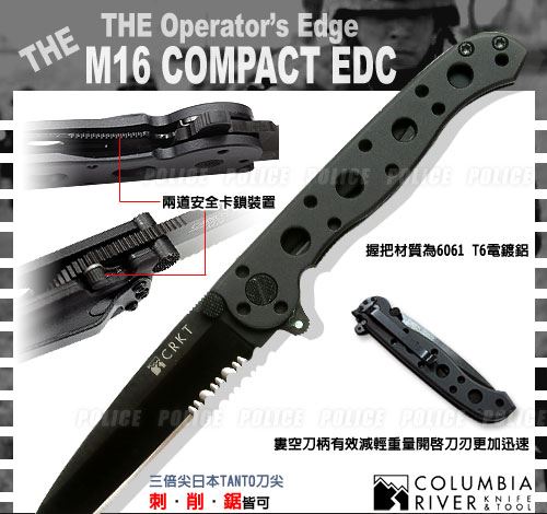 來自肯塔基州的齊特.卡森 Kit Carson是CRKT著名的刀具設計師,他是一位退伍的軍隊上士,具有28年的製刀經驗。從1993年起成為製刀師,同時也是刀匠 協會選出的會員。齊特.卡森 Kit Carson在CRKT設計的M16系列,不隨波逐流,堅持功能第一,取得了巨大的成功! M16 COMPACT EDC系列是 齊特.卡森 (Kit Carson) 沿襲原始的 M16 系列所創新改款的小型折刀。此款折刀如同牠所被命名的使命 EDC(Every Day Carry) 輕巧方便隨時攜帶,無論是工作時或是休閒活動時。輕巧但高功能性的設計,適合小身型的人,例如騎師和羽量級拳擊手,都能完全握把住。 我們為了真正困難的工作者,製作了此款握把材質為 6061 T6電鍍鋁,外觀為長型的戰術折刀。以CNC機械製作,為了舒適感所設計由摩擦溝輪不鏽鎖輪籍來提供完美的上鎖。我們也結合了LAWKS a (Lake And Walker Knife Safety)專利。在M16系列中,當使用折刀時可隨時確定固定刀身的功能。高優質AUS8 不鏽鋼表面加覆一層黑色烤漆 ,讓刀刃的邊緣鋒利持久, 使把刀充滿野性與戰鬥的美感! 此款折刀為 Tanto風格,刀身與二片簍空握把設計讓此把刀發揮出最大的效力。 M16 COMPACT EDC系列握把共有黑色和綠色兩種外觀。為了讓操作者在使用時能更順暢,我們特別將握把材質設計為6061 T6電鍍鋁合金,具備了防鏽?的功能。握把上的鏤空設計,減輕了整把刀的重量外,更有止滑及在水中使用過後,讓水快速流出的好處。重要的是,重量只有58 g卻能產生巨大的破壞力,讓您在使用時,只須稍稍用力的一壓,刀刃就會瞬間的彈開,再順勢用大拇指將第二道保險扣上, 可以確保您操作上的安全性,在使用時 完全無安全疑慮! 另外,附有的口袋夾讓您能隨身攜於身上任何的口袋中、背包的小袋子等等 … 相當的輕巧! 品名: CRKT戰術折刀 型號: M16-10K 尺寸 ( ±5﹪) :延展長 18 cm、收納長10.1 cm、刃厚0. 2 cm 重量 ( ±5﹪) :58 g 刀刃材質: AUS 8不鏽鋼 硬度: 58 HRC 設計者: 齊特.卡森 Kit Carson 附可拆式鐵氟龍衣服 /工具夾