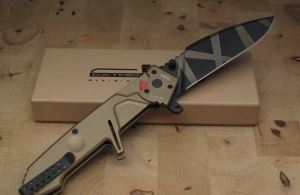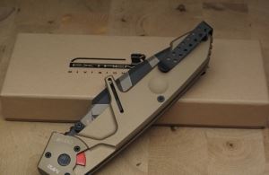 高强度耐蚀铝合金ANTICORODAL制成的柄材,握感良好不易滑手,此外刀片防护装置实现了刀具的快速开放并在使用时为手部提供保护。除了使用衬垫锁定外,这把刀还使用了加强的安全锁,提供了双重保障机制。刀柄后端的玻璃击破器,使用高强度耐冲击钢材制成,可应付各种紧急状况。背夹也为本刀款特点,在折刀收入口袋后,完全看不到握柄,隐匿性非常高。