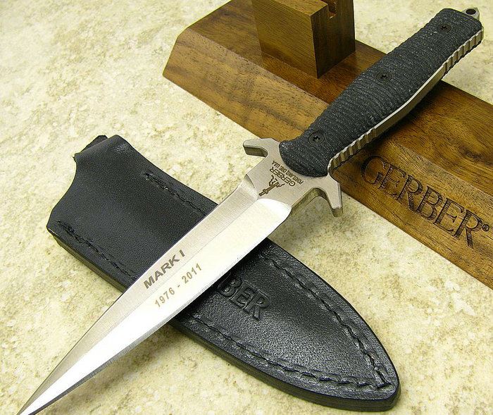 Gerber Mark I在1976年首次推出,是由美国军队在越南战争期间使用的Mark II的格斗刀的设计灵感而来。这款Gerber Mark I戈博马克I型0412格斗刀是Gerber公司为纪念Mark I的诞生而出品的35周年纪念版,限量1500把,在刀身上激光雕刻生产数量及1976-2011字样,它有一个高品质的黑色皮套和坚实的胡桃木展示架。