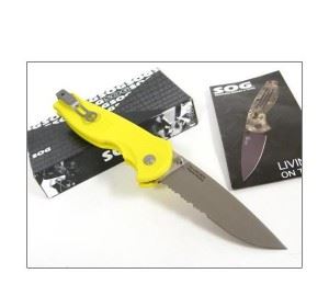 美国哨格SOG YFSA-98 炫黄色柄闪光快开二代银色半齿折刀