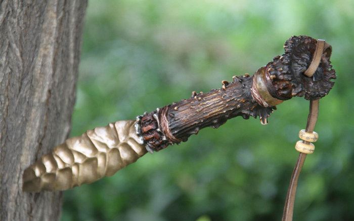 全长 27cm刃长 13cm刃厚:4mm柄材:大马士革钢、鹿角、琥珀、动物韧带、牛皮