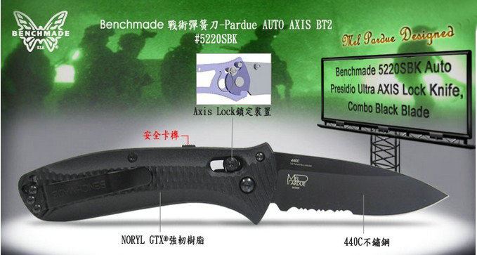 当前位置: 世界名刀首页 > 世界各国名刀 > 蝴蝶 > 美国蝴蝶BENCHMADE 5220SBK 黑色半齿侧跳