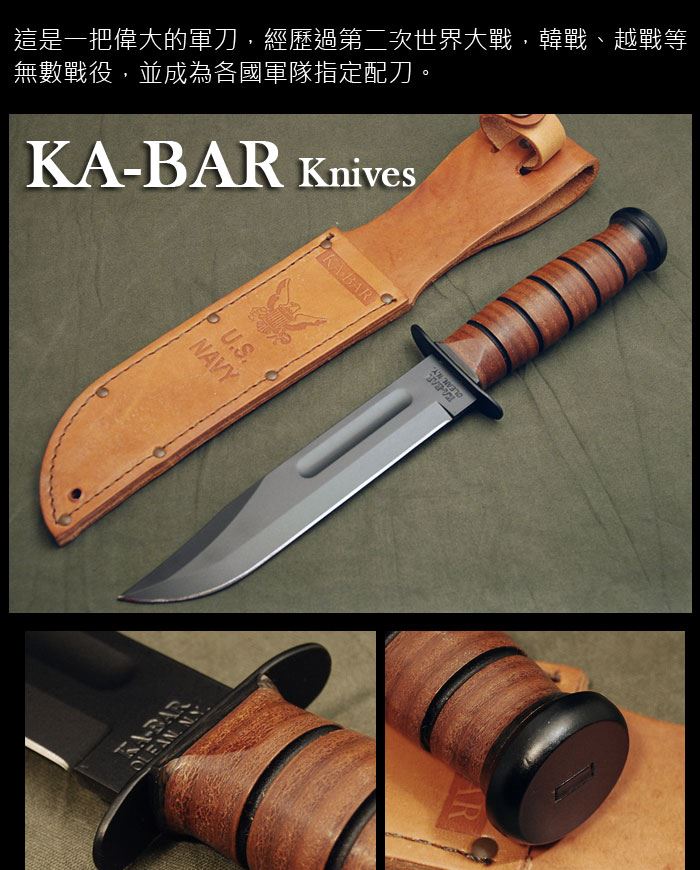 KA-BAR 美国卡巴 1225 美国海军用刀刀刃材质为 USSI 1095高碳钢,并经热处理,不论是硬度、抗裂、耐压度表现都在高水平之上。握把系使用真皮,经强力压缩使用时不易滑手,握把与刀刃比重适宜,掌握性良好,是最好的战斗攻击刀。刀刃表面有一层特殊黑漆处理,不易生锈,刀刃开锋是人工处理,锐利非常。附真皮皮套,不论收藏与实用都适宜。