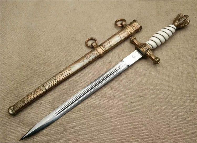 二战纳粹德国海军短剑,黄铜刀鞘和装具,刀身完好无伤。第三帝国鼎盛时期索林根制造,著名的WKC厂标。