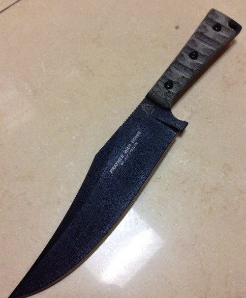 Tops Prather War Bowie. 12 5/8" overall. 7 1/4" 1095 high carbon steel blade with black traction coating. Full tang. Matte gray linen micarta handles with Rocky Mountain tread texturing and black finish stainless screws. Olive green and tan braided lanyard. Black ballistic nylon MOLLE compatible belt sheath with hard liner and utility pouch. Includes bonus Lansky Quick Fix Pocket Sharpener. (USA)