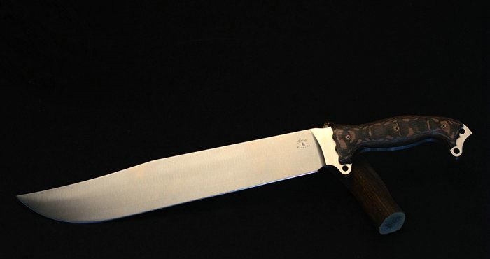 相信资深刀友对Busse这个名字一定非常熟悉,BUSSE刀具公司主要做独特的定制高端刀具。BUSSE刀具从最原始的生产作坊成长为现在非常现代化和高度自动化的刀具公司仍然一惯坚守“生产世界上最高品质刀具,提供业界最严格终身保证”的宗旨,使公司很快就发展成为高品质刀具界的领头人,并且一直倍受关注。 正因Busse刀具创造了至高无上的品质传奇,使得20几年以来数以千记的 Busse 刀具被业界接受和珍藏;由于其非凡的品质,使得Busse刀具有“核战刀具”这一美称。因此,拥有一把Busse刀具是大多数刀友们的理想与追求。 Busse从简陋的小作坊一路成长为世界顶级刀具制造商,他们从不骄傲、从不自满,作为高性能战斗刀具的世界领导者,Busse不曾将最初的目标遗忘——The World Leader in Extreme Performance Knives(做极端性能刀具的世界领导者)! INFI全角度透视 硬度:经热处理后INFI的硬度可达58-60HRC,这样的数据说起来并不突出,但在同等硬度下它的延展性是最好的,用作刀身坚韧不易折断。 灵活性:在巴斯公司对INFI的测试中,将使用INFI做刀身的Battle Mistress(战斗情妇),用虎钳折弯35度依然可以自动弹回,如同弹簧般,展现出INFI强大的韧性和均匀的横向强度。 刀锋保持力:许多刀具专家总是把到刀锋的保持力和抗磨损性能联系在一起,这当然是一种正确的说法。INFI在硬度和耐磨性上取得了良好的平衡,因此边缘保持上也表现不凡。 防锈性:经试验证明,带着一把INFI的刀具穿过高山荒野、热带雨林时,在抗污防锈上展示了自己最杰出的一面。虽然它的铬含量并没有达到不锈钢的标准,但在防锈上已经十分突出。毕竟,它是巴斯战斗刀的专用刃材,还可以增添涂层进一步提升防锈性。 型 号: MOAB 全 长: 525mm 刃 长: 340mm 刃 材: INFI 硬 度: 58-60HRC 表 面: 钢本缎面 刃 厚: 9mm 柄 长: 148mm 柄 材: 定制非洲木柄 重 量: 1150g 产地: 美国
