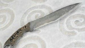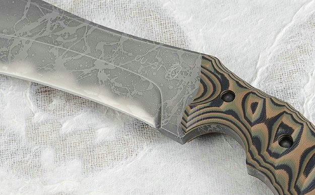 雷(Ikazuchi)是菊男老师2014年的最新战术作品之一,采用凶猛的砍刀(Machete)刃型,整体类似于晴岚,但拥有更加出色的多研磨(Multi-grind)刃面。砍刀微微弯曲的刀型继承了廓尔喀弯刀的优点:势大力沉,易于劈砍。刀背上的假刃从刀尖一直延伸至刀背尾末,刀身也从宽阔渐变细窄,作品的重心位于刃部前端。这种巧妙的力学设计就如同发挥了撬杠原理,劈砍切削的能力非常惊人,能直接表现出令人恐惧的撕裂性。传说中,善战的廓尔喀勇士可以一刀斩下猎物的头颅。 刀身沿用菊男老师钟爱的OU-31钢,刃部前端采用凸磨式研磨,让刀具拥有极强的抗压能力,保证刃部的稳定性;刃部后端以凹磨打磨,更具切割力,扇贝型的研磨刃面具备惊人的“咬合力”。这种多研磨面技巧也被称之为“Dural GroundEdge”,即双重开刃方式。S形刀具轮廓让刀头部分分量十足,在挥舞式能产生意想不到的破坏力,针尖状的刀头和菊男出色的研磨让其破入力出色,可轻松破入轻型防护装置。刀身表面采用菊男独特的战术蚀刻花纹处理,刀根上端刻有“菊”字标识和钢标号。 手柄两侧装有黑/棕/绿相间的蛇纹G-10贴片,精心设计的防滑纹理和槽口令用户可以非常安全地握持,配合指槽设计,具备绝对可靠的抓握手感。尾部有大型圆孔,可穿系绳结、头珠类的刀具饰品。并带有V型攻击头,可轻松击碎砖石、车窗。 随刀配有黑色Kydex刀鞘以及Tek-Lok皮带夹装置,方便用户随身携带。 品牌 KikuMatsuda 松田菊男 型号 KM-410 材质 OU-31 全长 39.2 CM 刃长 24 CM 刃厚 0.65 CM 刃宽 5.12 CM 硬度 62 HRC 柄材 米卡塔 产地 日本 附件 Kydex刀鞘 重量 693克