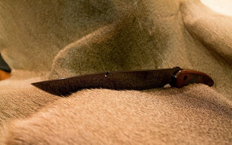 材质:5160碳钢硬度:60HRC产地:美国限量号:***/500 此款直刀采用5160 STEEL钢材,SMS处理方式,大前锋,刀身背部有沟槽,可以进行特殊作业,手柄使用的是Micarta,可以更好的把握住! 罗恩罩设计黑镜面5160碳钢刀片.花纹黄檀木柄,红木展刀示架。没有鞘。